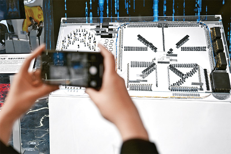 图为2023年4月26日,观众在第二届中国(安徽)科技创新成果转化交易会上拍摄“九章”光量子计算原型机模型。本届科交会的主题为“推动创新链产业链资金链人才链深度融合,提高科技成果转化和产业化水平”。 新华社记者 黄博涵/摄