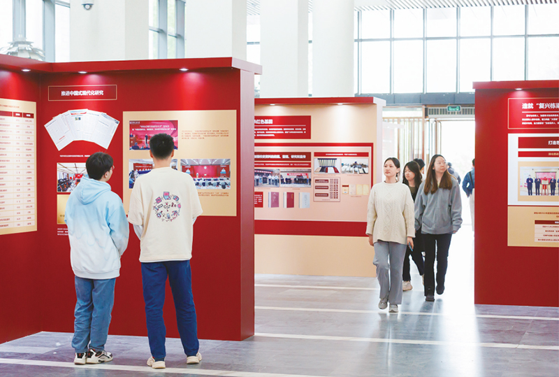2023年4月25日,中国人民大学推出“习近平总书记考察调研中国人民大学一周年 走出一条建设中国特色世界一流大学新路”主题展。图为学生参观展览。 中国人民大学供图