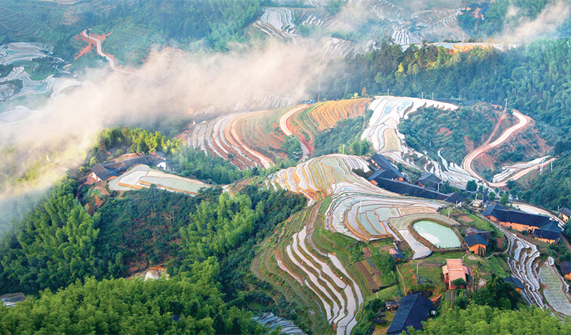 近年来,水利部门坚持山水林田湖草沙一体化保护和系统治理,扎实推进水土流失综合治理,强化江河湖库生态保护治理。图为入选2022年度(第九批)世界灌溉工程遗产名录的江西省赣州市崇义县上堡梯田,该工程包含完善的农田水利灌溉系统和良好的生态保护系统,充分体现了尊重自然、顺应自然、保护自然的理念。 水利部供图 卢鑫平/摄