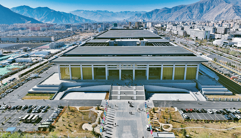 2023年12月15日,西藏大剧院开台演出活动举行,西藏文化新地标西藏大剧院正式启用。图为空中俯瞰西藏大剧院(无人机照片)。 新华社记者 晋美多吉/摄