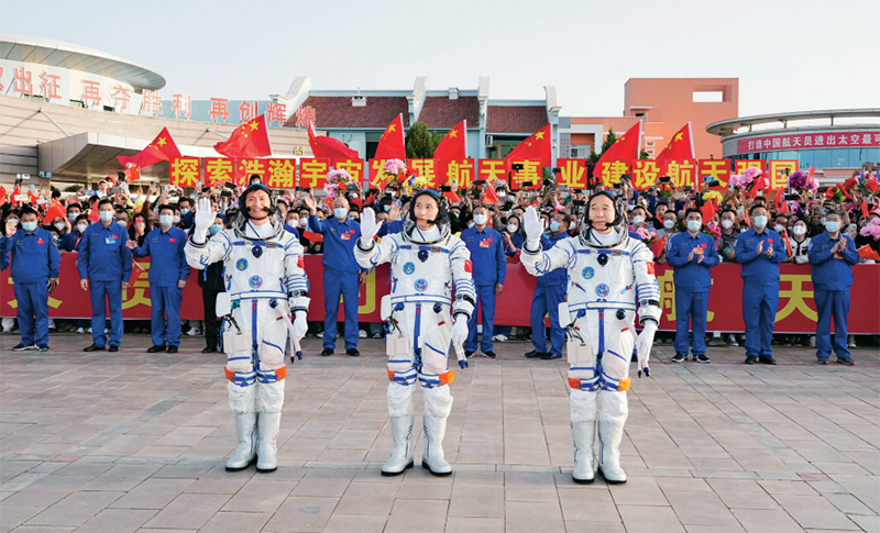 2023年5月30日,神舟十六号载人飞行任务航天员乘组出征仪式在酒泉卫星发射中心问天阁圆梦园广场举行。这是航天员景海鹏(右)、朱杨柱(中)、桂海潮在出征仪式上。 新华社记者 李刚/摄