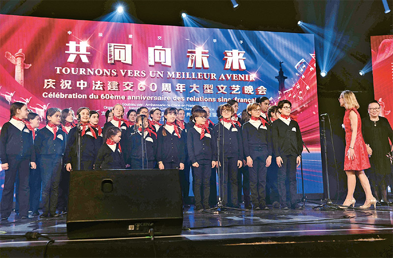当地时间2024年1月16日晚,以“共同向未来”为主题的庆祝中法建交60周年大型文艺晚会在巴黎举办。图为法国宝丽声童声合唱团演唱歌曲。 中新社发