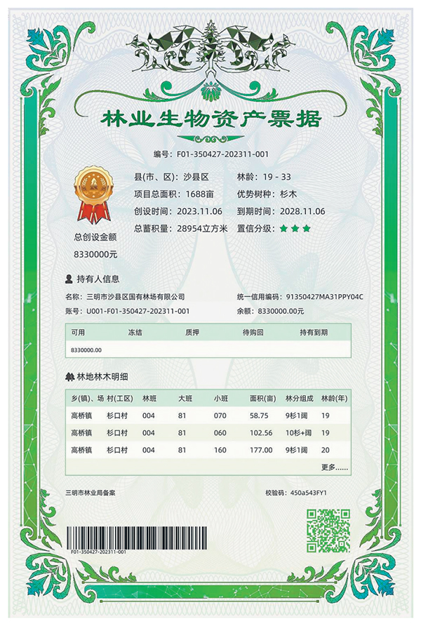 图为2023年11月6日福建省三明市发布的全国首张林业生物资产票据。 福建沙县农村产权交易中心供图