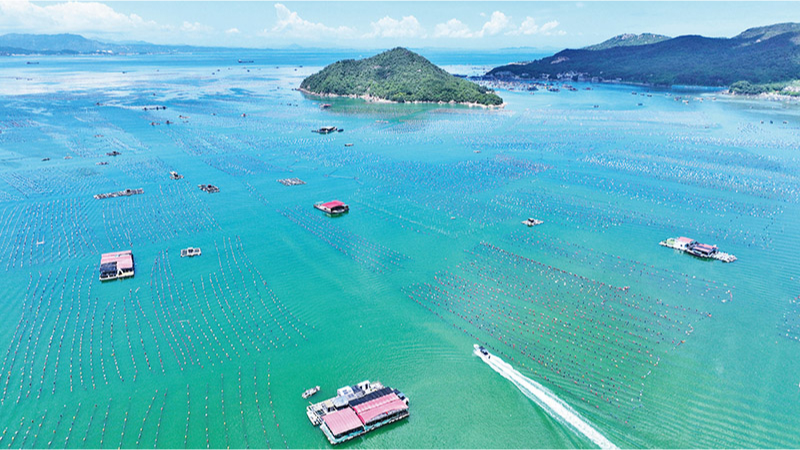 2024年,新修订的海洋环境保护法施行,进一步强化陆海统筹、区域联动、综合治理,在海洋污染防治、生态保护修复、监督管理执法等方面明确一系列创新制度和务实举措。图为2024年7月21日,在广东省汕头市南澳县深澳镇,万亩蓝色“粮仓”壮美如画。 人民图片 胡江涛/摄