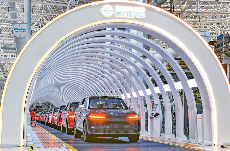 党的二十届三中全会提出,培育壮大先进制造业集群,推动制造业高端化、智能化、绿色化发展。近年来,重庆把发展智能网联新能源汽车作为培育新质生产力的重要抓手,不断推进产业链、创新链融合发展。图为2024年6月7日在重庆赛力斯汽车超级工厂拍摄的即将下线的整车。 新华社记者 王全超/摄