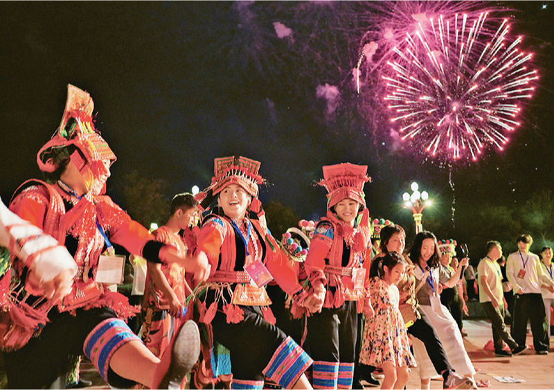 2024年7月27日晚,“火火欢歌”中国·楚雄2024年彝族火把节在云南省楚雄彝族自治州楚雄市启幕。图为当地彝族群众与游客载歌载舞,共度佳节。 新华社记者 王静颐/摄