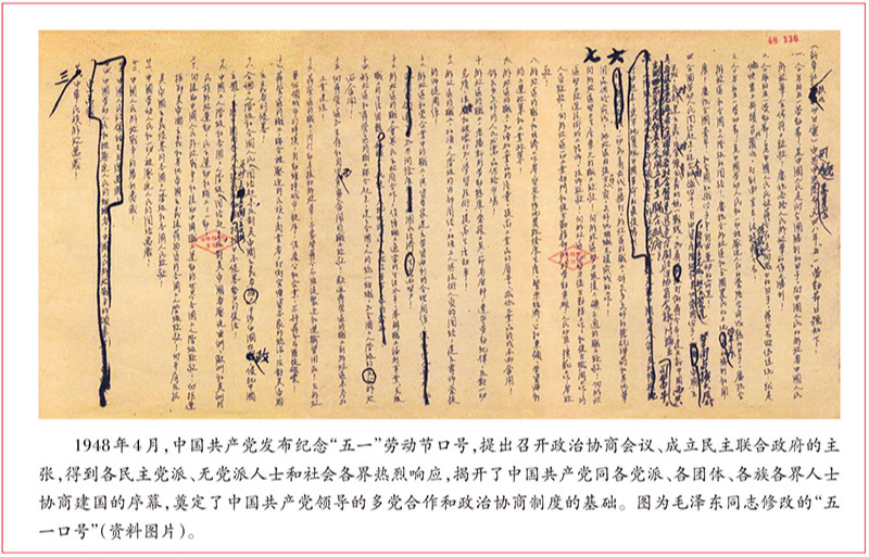 抗日战争胜利后,国民党疯狂镇压民主运动,主要成立于抗日战争和解放战争时期的各民主党派在反对国民党独裁专制、争取民主自由的斗争中,逐渐认识到只有中国共产党才能救中国,只有跟着中国共产党走才有光明前景。他们抛弃幻想,更加坚定地选择与中国共产党并肩战斗。中国共产党同各民主党派建立了亲密的合作关系,真诚欢迎各民主党派参加协商建国,对多党合作态度坚定而明确。1948年4月,中国共产党发布纪念“五一”劳动节口号,提出召开政治协商会议、成立民主联合政府的主张,得到各民主党派、无党派人士和社会各界热烈响应,揭开了中国共产党同各党派、各团体、各族各界人士协商建国的序幕,奠定了中国共产党领导的多党合作和政治协商制度的基础。1949年9月,由中国共产党和各民主党派、人民团体、无党派民主人士参加的中国人民政治协商会议第一届全体会议召开,通过了具有临时宪法性质的《中国人民政治协商会议共同纲领》,标志着中国新型政党制度的确立。