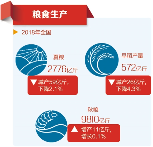 总体来看,2018年我国粮食生产基本稳定,全年粮食总产量虽因夏粮、早稻减产有所下降,但减幅不大,仍稳定在13000亿斤以上,处于历史较高水平。种植结构进一步优化。分季节看,夏粮、早稻减产,秋粮增产。2018年全国夏粮2776亿斤,减产59亿斤,下降2.1%;早稻产量572亿斤,减产26亿斤,下降4.3%;秋粮9810亿斤,增产11亿斤,增长0.1%。