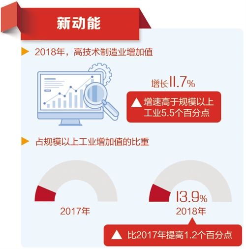 随着创新驱动发展战略的大力实施,新产业、新业态、新商业模式层出不穷,新技术、新产品、新服务不断涌现,新动能成为保持经济平稳增长的重要动力。2018年,规模以上工业战略性新兴产业增加值比2017年增长8.9%,规模以上工业高技术产业增加值比上年增长11.7%,分别高于整个规模以上工业2.7个和5.5个百分点。1月份至11月份,规模以上科技服务业企业营业收入同比增长15.0%,战略性新兴服务业企业营业收入同比增长14.9%,分别高于全部规模以上服务业企业营业收入增速3.5个和3.4个百分点。