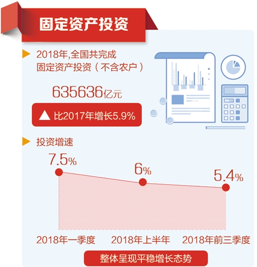 2018年,全国共完成固定资产投资(不含农户)635636亿元,比2017年增长5.9%。2018年一季度、上半年和前三季度投资增速分别为7.5%、6%和5.4%,整体呈现平稳增长态势。