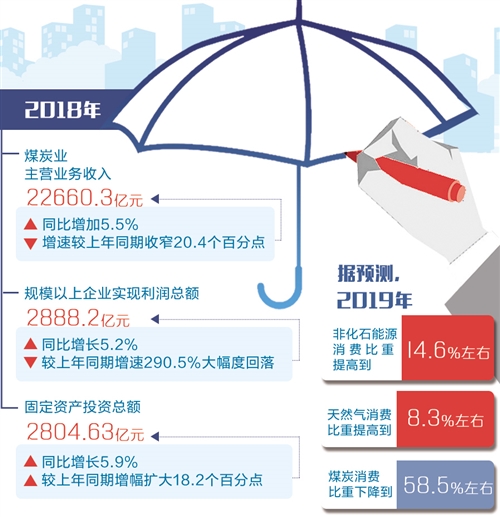 此外,煤炭占能源总消费比重下降也是大势所趋。据预测,2019年非化石能源消费比重将提高到14.6%左右,天然气消费比重提高到8.3%左右,煤炭消费比重下降到58.5%左右。