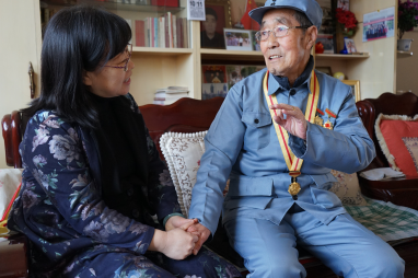 两年前受到总书记接见的刘丙涛老人如今已经90岁了,见到我们,他自豪地穿上受总书记接见时穿过的八路军军装,明亮的勋章骄傲地闪在胸前。17岁时他曾一个人赶着54头毛驴,驮着从陕西神木采购的盐、糖、铅笔等物资运到兴县晋绥边区,如今的他依然保持着每天看新闻读报纸的习惯,桌边的小纸条记录着他读书看报的点滴心得。谈到总书记,谈到新中国的70年历程,他的手微微颤抖,“毛泽东让中国人民站起来,邓小平让中国人民富起来,习近平正带着中国人民强起来”,说到这里,老人眼角闪现着点滴泪花。