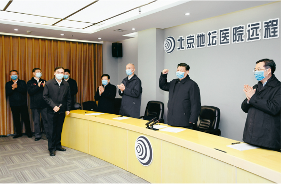 2020年2月10日,中共中央总书记、国家主席、中央军委主席习近平在北京调研指导新冠肺炎疫情防控工作。这是习近平在首都医科大学附属北京地坛医院远程诊疗中心,通过视频连线武汉市收治新冠肺炎患者的金银潭医院、协和医院、火神山医院,了解情况、听取意见和建议,慰问一线医务工作者。新华社记者 谢环驰/摄