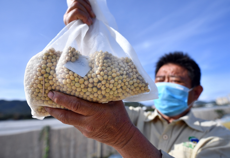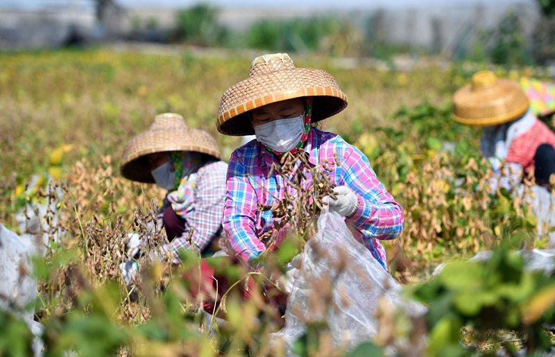 早春时节,海南三亚的南繁科研工作进入了繁忙季节。为减少疫情对科研工作带来的影响,三亚市南繁科学技术研究院通过与省外的南繁单位进行视频连线,开展代管、代收、寄送等服务,多措并举,确保南繁科研不间断。图为2月27日,工人在采收中国农业科学院油料作物研究所在三亚繁育的大豆。新华社记者 郭程/摄