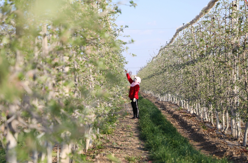 进入4月,甘肃省庆阳市宁县苹果生产基地一片农忙景象,果农们为果树剪去多余的枝叶,保证花期顺利到来。苹果产业是宁县目前的主导扶贫产业,近三年间,宁县借助苹果产业带动全县9000余户贫困户稳定脱贫。图为宁县王庄村村民刘彩红在苹果生产基地内修剪果树。新华社记者 张睿/摄