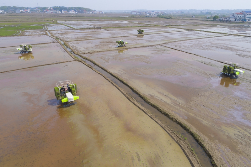 发力“单改双” ,水稻大省湖南的双季稻攻坚战。图为2020年4月8日,在湖南省汨罗市罗江镇黄市村,村民利用插秧机进行插秧。新华社记者 周敏/摄