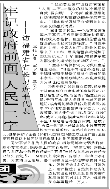“我们要始终牢记政府前面的‘人民’二字,对群众的悲欢冷暖感同身受。”2002年3月4日,人民日报两会特刊的“代表团之声”栏目里,刊发了对时任福建省省长的习近平代表的采访,标题是《牢记政府前面“人民”二字》。