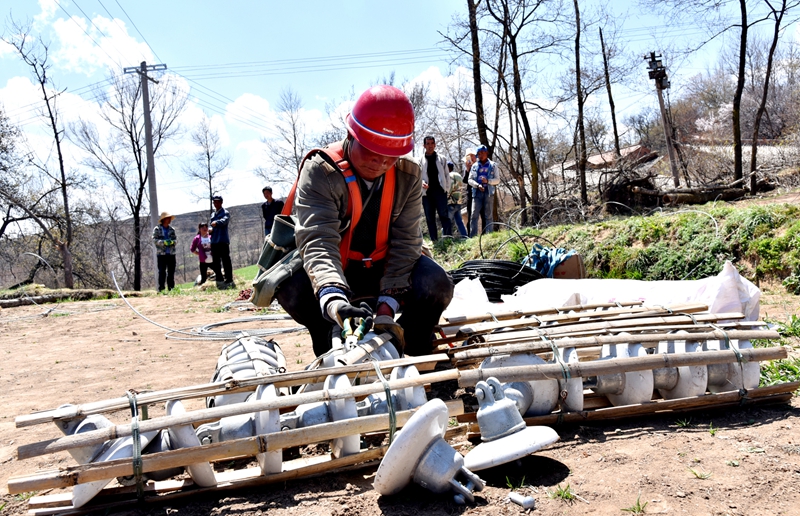 2013年以来,元古堆脱贫攻坚如火如荼展开:工程、项目、产业齐头并进。这是工人在安装电力设备。元古堆村委会供图