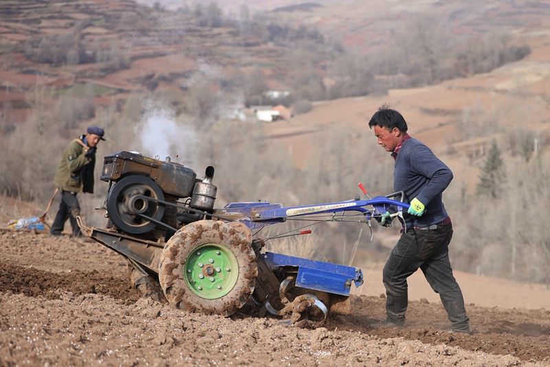 随着甘肃省新冠肺炎疫情逐渐好转,春耕是目前的头等大事。元古堆村民路彦荣推着新式手扶拖拉机,在地里干活格外起劲。人勤春来早,一鼓作气,再出发!新华社发 马希平/摄