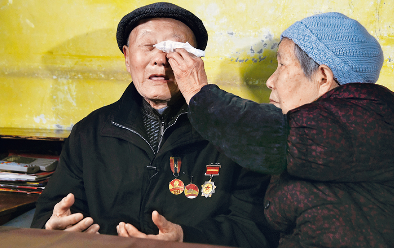 张富清是原西北野战军359旅718团2营6连战士,在解放战争的枪林弹雨中九死一生,先后荣立一等功三次、二等功一次,被西北野战军记“特等功”,两次获得“战斗英雄”荣誉称号。1955年,张富清退役转业到湖北省最偏远的来凤县工作,为贫困山区奉献了一生。张富清用自己的朴实纯粹、淡泊名利书写了共产党人的初心和使命。图为2019年3月,张富清回忆当年并肩作战的战友们牺牲时的情景,不禁泪流满面。新华社记者 程敏/摄