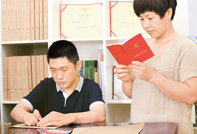 党的十九大根据形势任务发展变化,吸收党的理论创新和实践创新成果,对《中国共产党章程》进行修改完善,实现了党的根本大法的与时俱进。图为浙江省余姚市阳明街道党员、盲人按摩师俞恒立,在妻子的帮助下将党章刻为盲文,便于日常学习。人民出版社供图