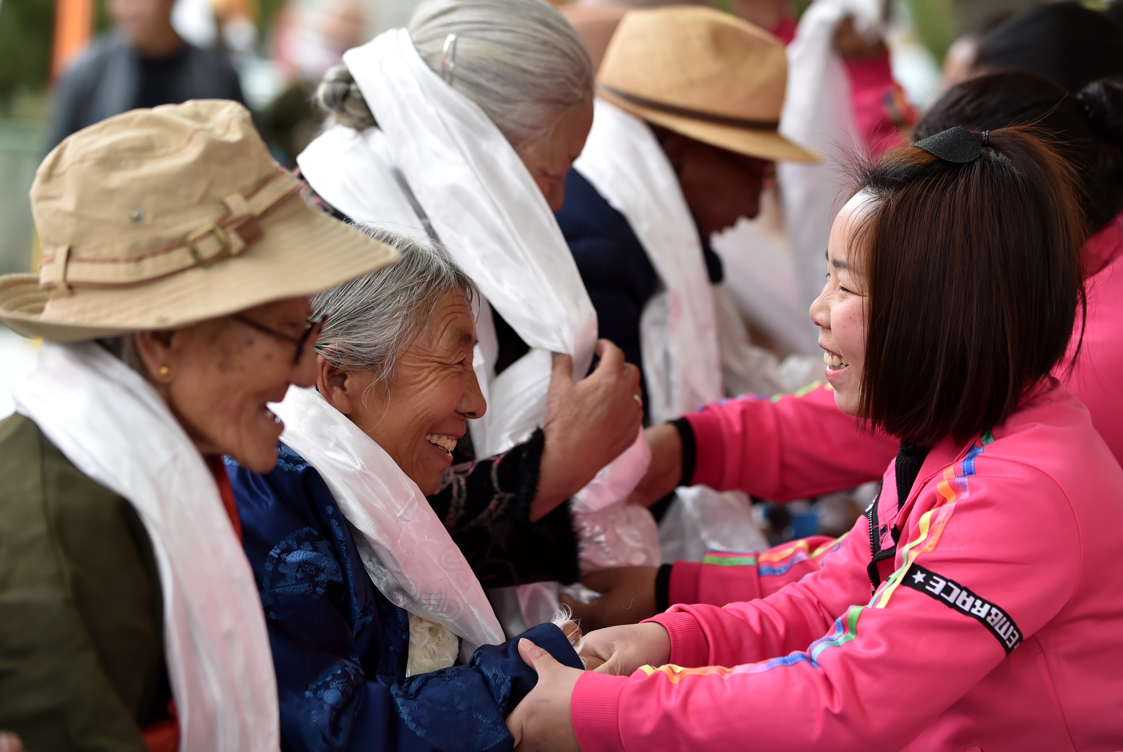 2019年3月23日,年轻人把洁白的哈达献给老人。当日,拉萨市西郊安居苑内,各族群众载歌载舞,庆祝西藏民主改革60周年。新华社记者 觉果/摄
