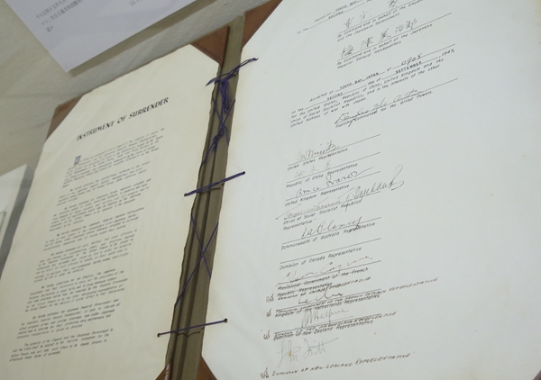 日本外务省外交史料馆2015年8月31日展出日本二战无条件投降书原件。这是外务省时隔20年再次公开投降书原件。图为2015年9月1日在日本东京外务省外交史料馆内拍摄的日本二战无条件投降书原件。新华社记者 刘天/摄