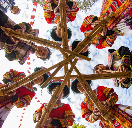 云南省着眼于优秀文化传承,把文化阵地建到农户,使村民积极参与活动,丰富群众文体生活。图为2018年2月25日,云南民族村苗族村寨的苗族同胞正在跳芦笙舞。云南画报社供图 张有林/摄
