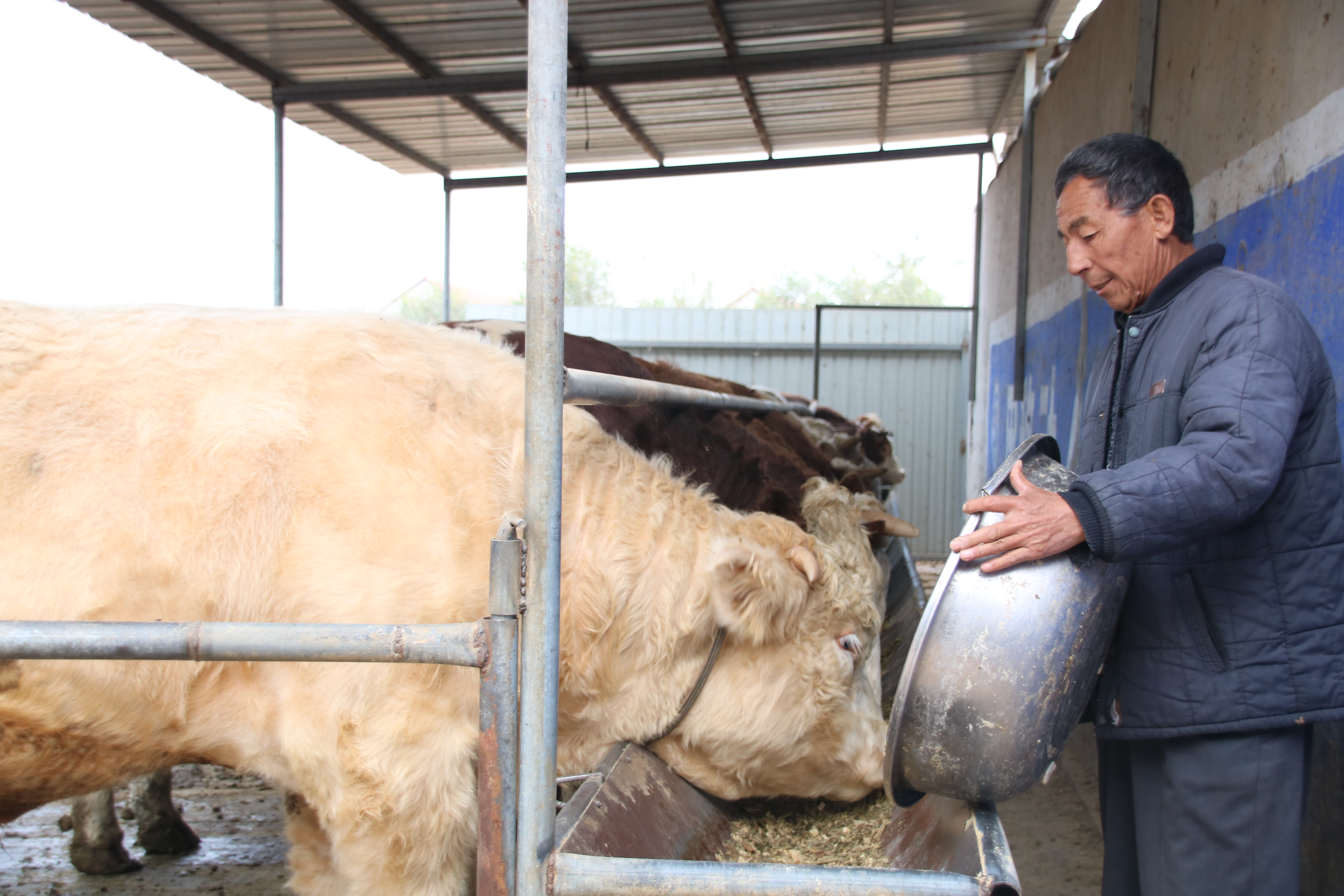 图为2020年10月29日,山东省阳信县温店镇大营村村民冯光岐正在喂养从借箭牛业公司“赊”的牛。阳信县委宣传部 张勇/摄
