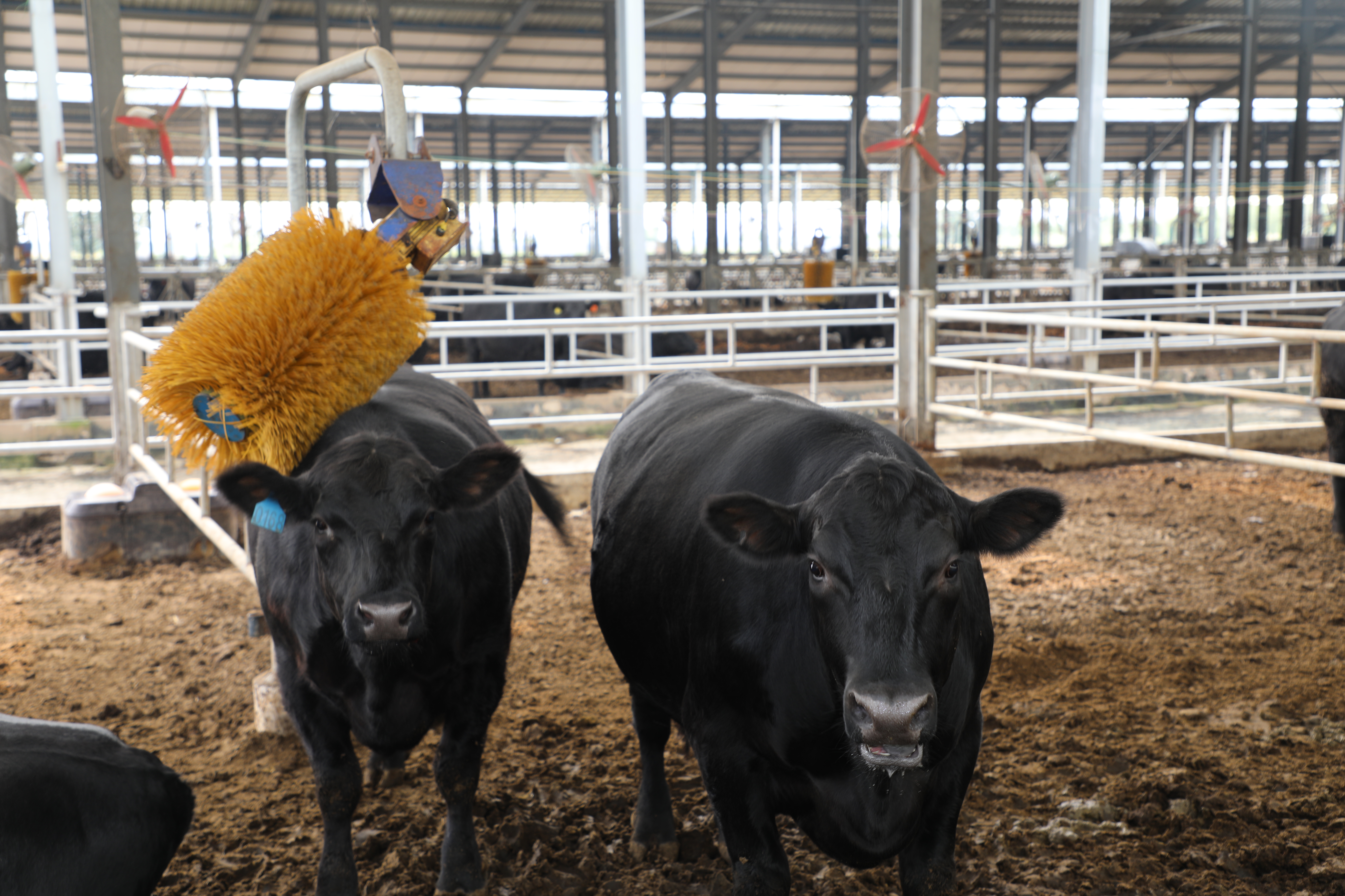 图为山东省阳信县肉牛企业现代化养殖车间里,渤海黑牛在做按摩。 阳信县委宣传部 张勇/摄