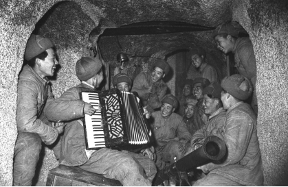 在朝鲜前线,虽然战斗激烈,生活艰苦,但中国人民志愿军战士始终保持着革命乐观主义精神。图为战斗间隙,志愿军战士歌声、笑声不断。新华社发 葛力群/摄