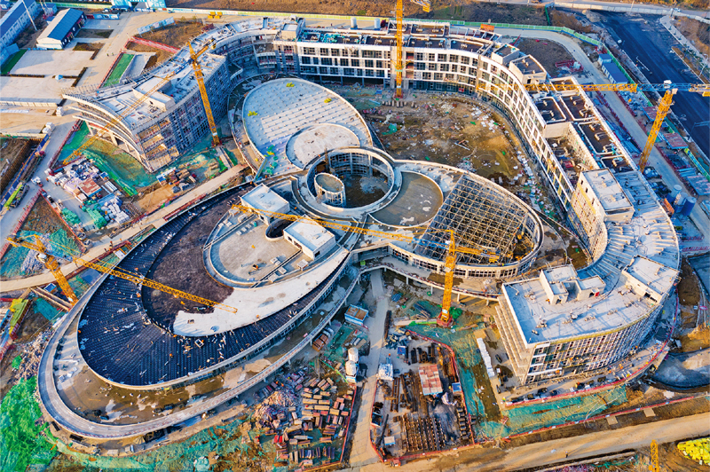 科技自立自强是促进发展大局的根本支撑。图为2020年12月16日,位于安徽省合肥市庐阳区的中科院聚变堆主机关键系统综合研究设施项目主建筑1—4号科研楼的4号楼最后一处正在封顶施工。聚变堆主机关键系统综合研究设施是《国家重大科技基础设施建设“十三五”规划》优先布局的大科学工程项目之一,为我国开展聚变堆核心部件研发和建设提供技术基础。 人民图片 阮雪枫/摄