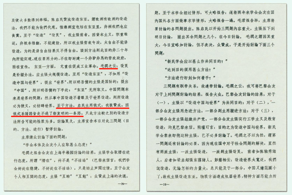 1921年元旦,毛泽东召集在长沙的新民学会会员18人,在文化书社举行新年大会,会议进行了3天。经过激烈的商讨,大家终于同意新民学会的宗旨为“改造中国与世界”。至于如何改造,毛泽东同何叔衡等12人赞成布尔什维克主义,并表示了对共产主义的信仰。这是《新民学会会务报告》中记录的毛泽东在大会上的发言(部分)。