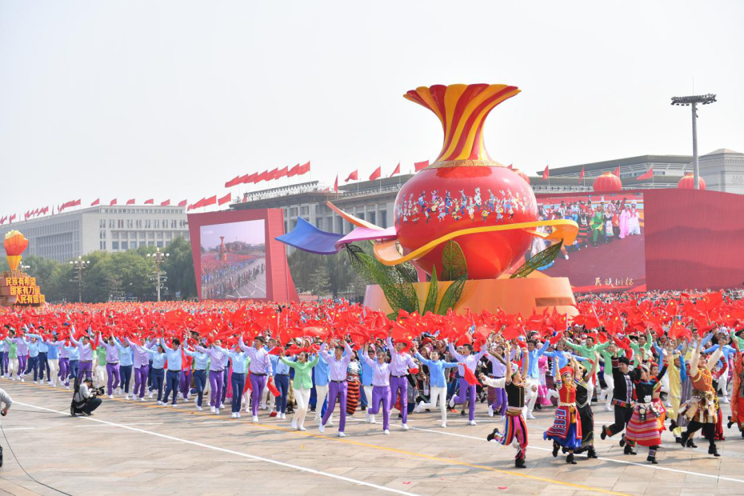 图片图为在庆祝中华人民共和国成立70周年大会上经过天安门广场的“民族团结”方阵。新华社记者 李尕/摄