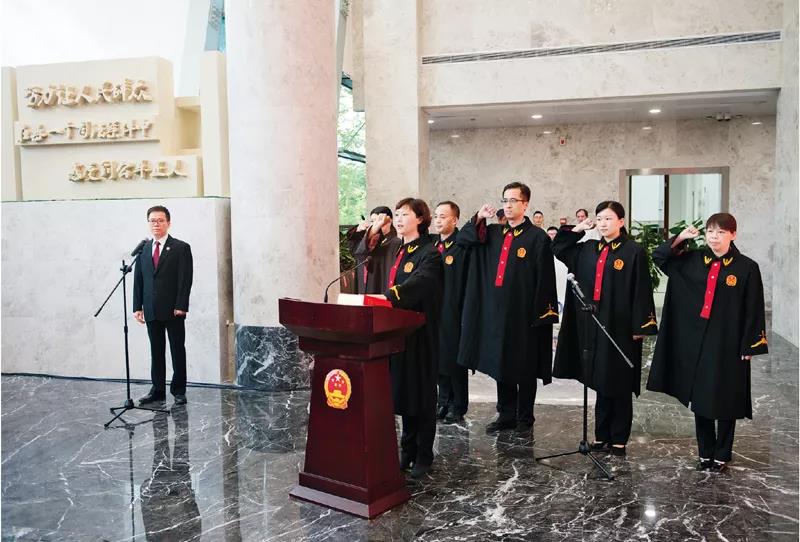 2017年8月18日,全国首家互联网法院在杭州成立。该法院定位于用互联网方式审理互联网案件,当事人通过互联网,足不出户就能完成诉讼,实现“网上纠纷网上了”。图为互联网法院成立当日,法官们参加宪法宣誓仪式。新华社记者 翁忻旸/摄