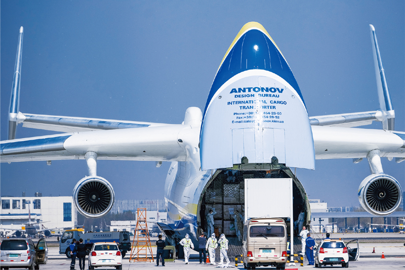 疫情以来,中国发起了新中国成立以来规模最大的全球人道主义行动。图为2020年4月13日,全球最大运输机AN225在天津滨海国际机场装载国际防疫物资。中新社记者 佟郁/摄