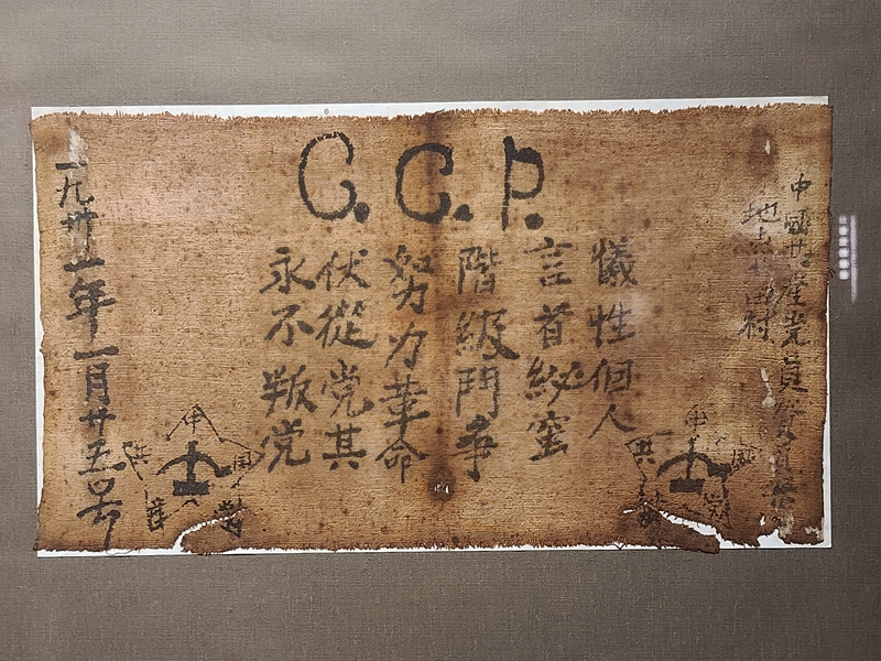 1931年1月25日,永新县北田村农民贺页朵在自家的榨油坊参加入党宣誓仪式,正式加入中国共产党,宣誓书上的字即是他当时所写。图为井冈山革命博物馆展出的贺页朵入党誓词。申小提/摄