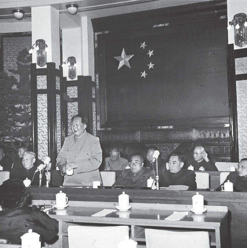 从1955年下半年到1956年初,我国生产资料的社会主义改造进入高潮,社会主义经济建设也有了几年的实践经验,对于苏联经济建设中的一些缺点和问题也逐步有所了解。以苏为鉴,总结自己的经验,探索一条适合中国国情的建设社会主义道路的任务,已经摆在党的面前。毛泽东关于十大关系的思想,就是在这样的背景下产生的。图为1956年5月2日,毛泽东在最高国务会议上进一步阐述十大关系。 新华社发