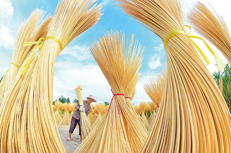 近年来,江西省赣州市会昌县因地制宜利用偏远山区深度贫困村4万余亩速生毛竹资源,形成毛竹种植、生产加工、销售的竹产业链,走出一条保护生态环境和发展绿色经济脱贫的路子。图为2020年7月11日,在会昌县周田镇河墩村,村民将晾晒好的竹筷半成品运回烤房进一步烘干。人民图片 朱海鹏/摄
