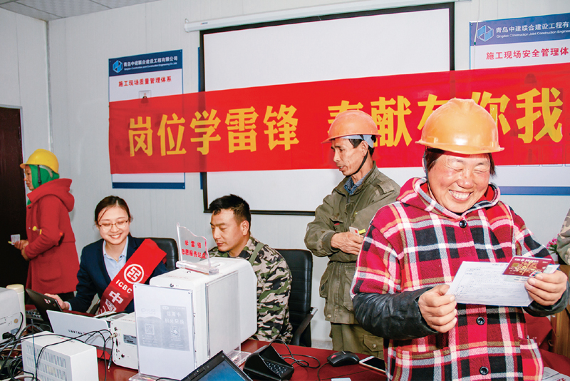 民生无小事,枝叶总关情。中国工商银行积极为广大群众实现美好生活提供安全、便捷、有温度的金融服务,全力服务民生保障。图为2019年3月8日,中国工商银行青岛分行员工到施工企业现场为农民工提供银行卡办理和工资代发服务。中国工商银行供图