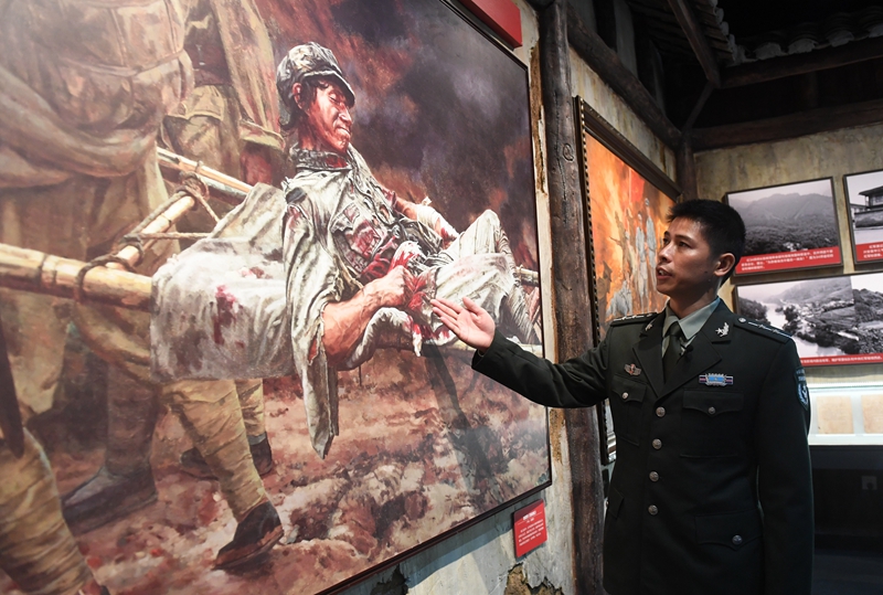 在广西桂林全州县红军长征湘江战役纪念馆,全州红军长征湘江战役文化保护传承中心副主任周运良在油画《陈树湘》前讲解(2021年4月25日摄)。 新华社记者 陆波岸/摄