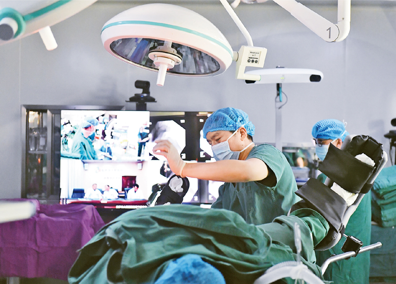 数字技术与医疗、农业、能源、建筑、服务业等紧密结合,正在推动传统产业日益高端化、智能化。图为2021年4月19日,拉萨市人民医院骨科医生在北京积水潭医院专家远程指导下,使用骨科机器人开展骨科手术。 新华社记者 孙瑞博 /摄