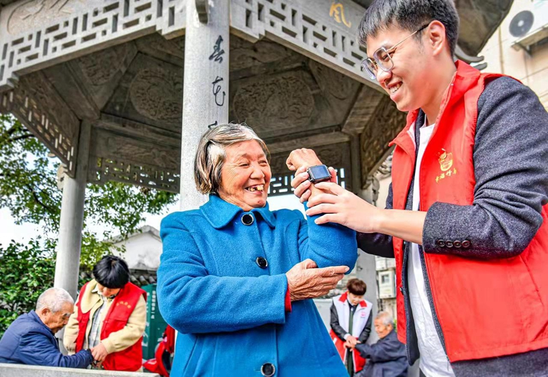 2021年11月24日,在浙江省金华市婺城区竹马乡下张家村,党员志愿者帮助老人戴上康养手环,并指导正确使用方法。康养手环可以实时监测老人的血压、心率、位置等信息。 人民图片