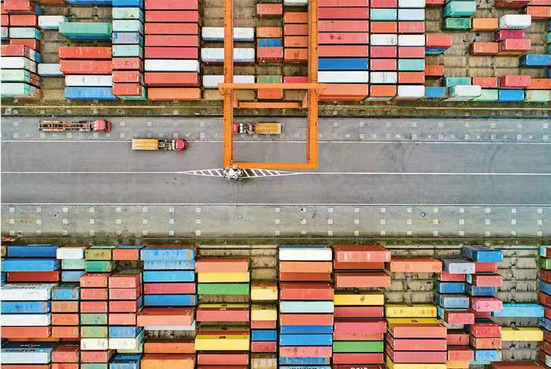 四川宜宾港依托物联网、5G 通信、可视化、智能化等先进信息技术,将传统码头升级改造成为智慧码头,全面提升港口智慧化、信息化作业水平。图为集装箱卡车在宜宾港集装箱码头往来穿梭,有序作业。 求是图片 庄歌尔/摄