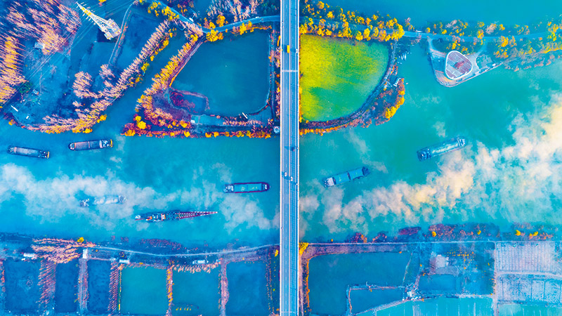 京杭大运河是古代交通文明成果和现代内河航运成果的历史见证。作为我国南北向的水上运输大动脉,京杭大运河在我国综合运输体系建设和长三角地区经济社会发展中具有重要的地位和作用。图为2021年12月4日,满载货物的船只通过京杭大运河江苏省宿迁市宿城段。求是图片 马海峰/摄