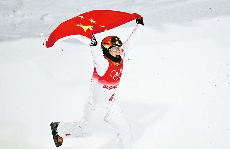 图为2022年2月16日,中国选手齐广璞庆祝夺冠。当日,北京2022年冬奥会自由式滑雪男子空中技巧决赛在张家口赛区举行,中国选手齐广璞获得冠军。新华社记者 肖艺九/摄