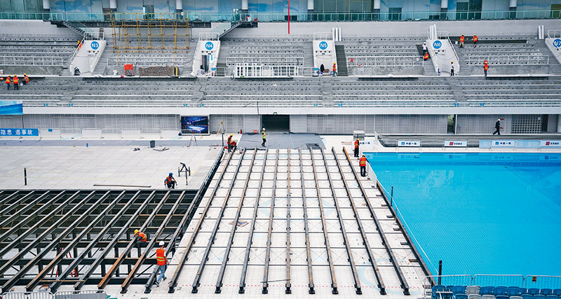 从“水立方”到“冰立方”,并非破除重建,而是在保有水上功能的基础上新增冰上功能,通过搭建可转换的钢架支撑结构和可拆装的制冰系统,创造性地实现“水冰转换”。