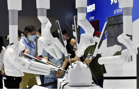 2021年5月20日,在天津梅江会展中心举办的第五届世界智能大会世界智能科技展上,智能科技成果展示令人目不暇接。图为参观者在展会上观看手术机器人展示手术过程。新华社记者 赵子硕/摄