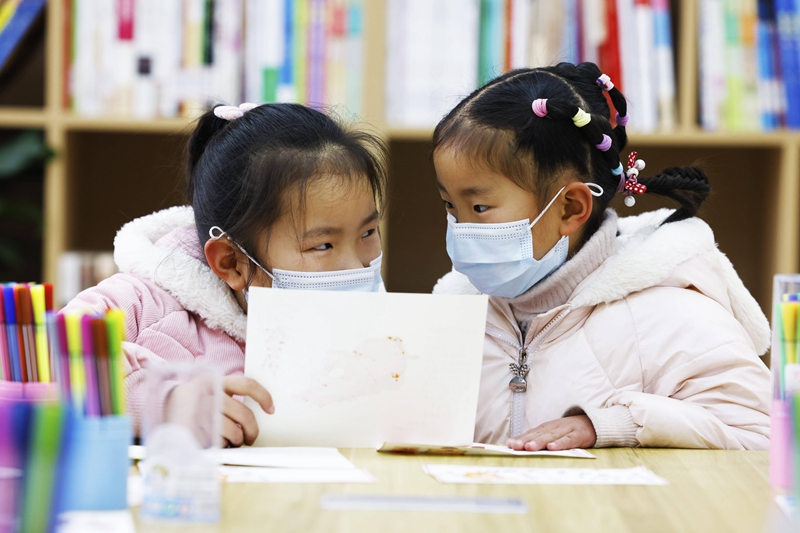 2022年1月22日,在江苏省宿迁市泗洪县瑶沟乡官塘社区新时代文明实践站,参加爱心托管班的小朋友交流绘制的年画。新华社发 许昌亮/摄