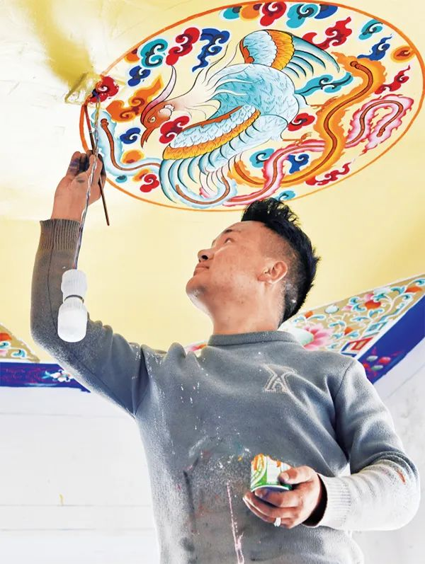 3月28日是西藏百万农奴解放纪念日。在西藏自治区日喀则市南木林县卡孜乡湘河水库移民新村,129户、685人庆祝喜迁新居。位于南木林县境内的湘河水利枢纽及配套灌区工程是国务院确定的172项重大水利工程之一,也是改善环境、发展生产、提高群众生活水平的民生工程。图为2022年3月27日,来自日喀则的民间艺人在湘河水库移民新村一处民居绘制屋顶。 新华社记者 张汝锋/摄